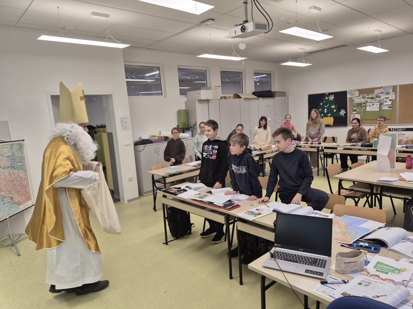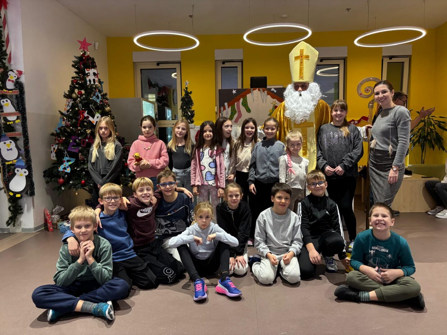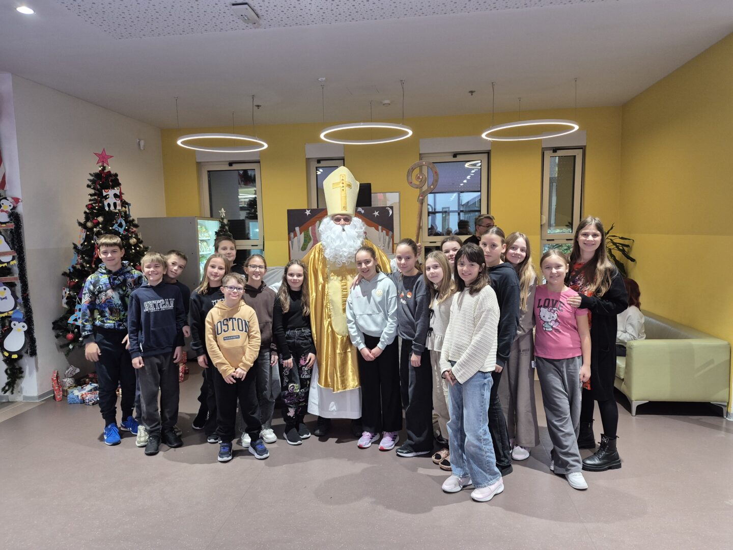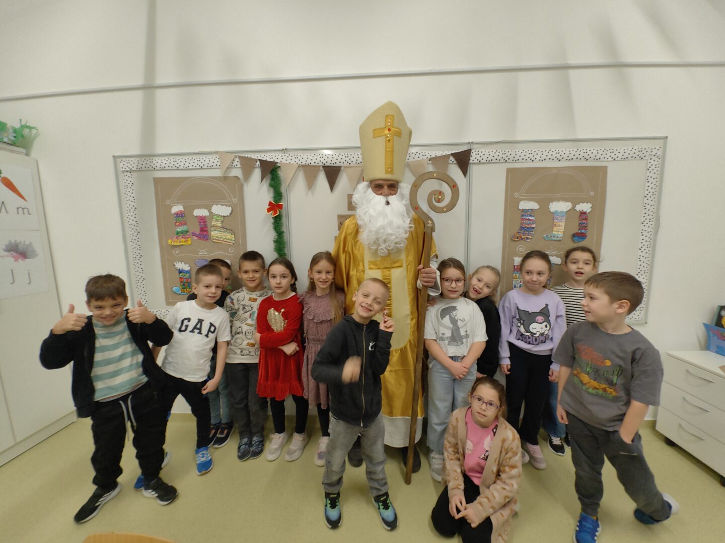 Nakon predstave učenike je iznenadio poseban gost – sveti Nikola! Dočekan je s puno veselja i osmijeha, a on je zauzvrat svima podijelio bombone te im poželio sreću, zdravlje i uspjeh u daljnjem školovanju.
